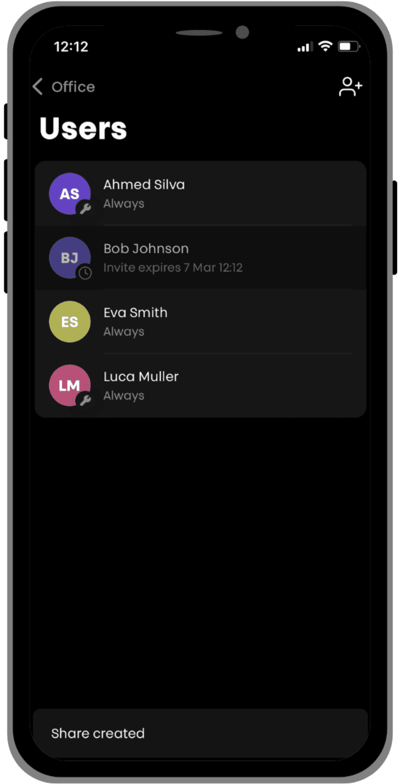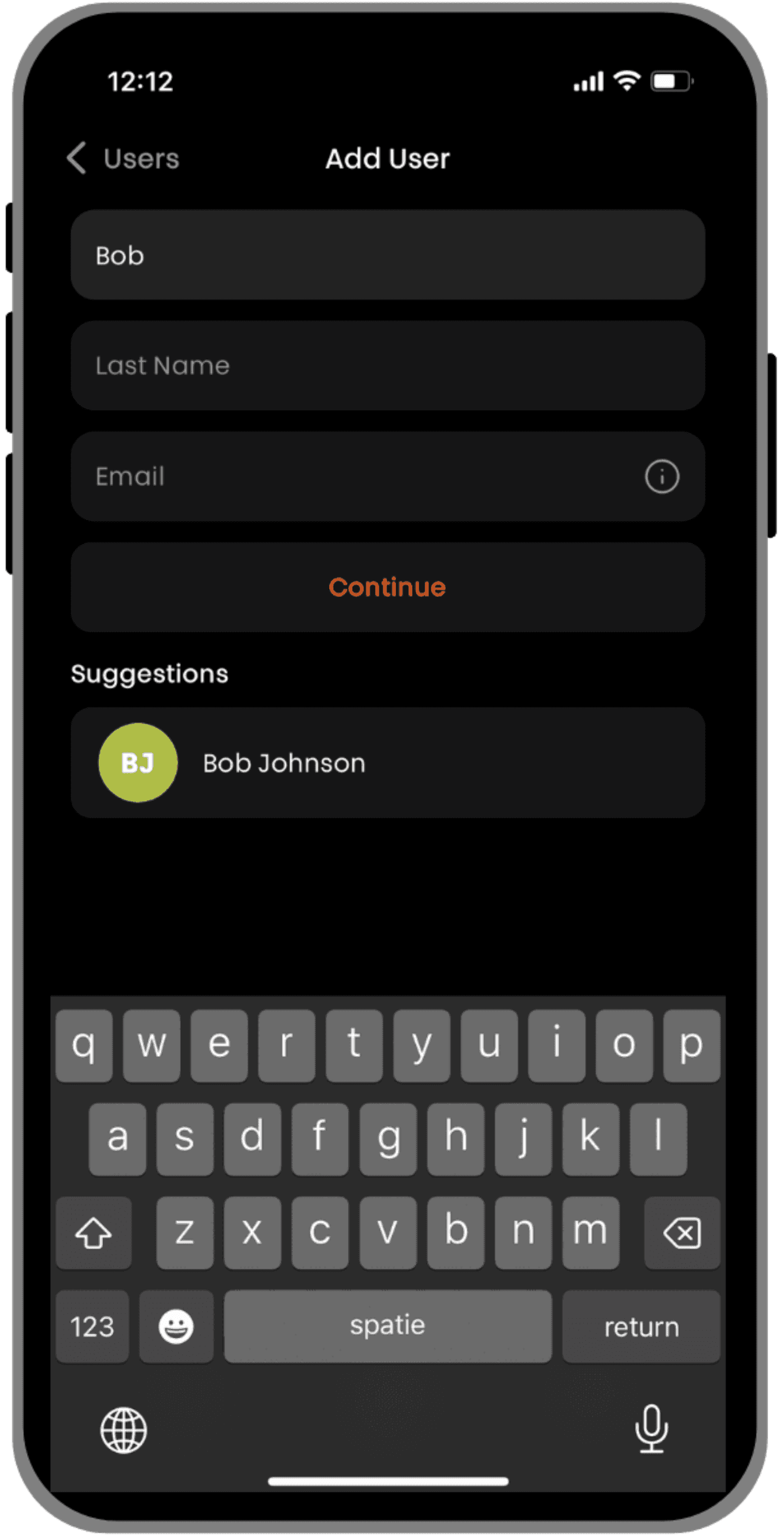 Je kunt nog steeds het adresboek van je telefoon gebruiken om nieuwe gebruikers toe te voegen, contacten verschijnen automatisch terwijl je typt, wat de kans op fouten verkleint en het proces versnelt. Staat het e-mailadres van de gebruiker niet in je contacten? Dan kun je het handmatig invoeren in de app.