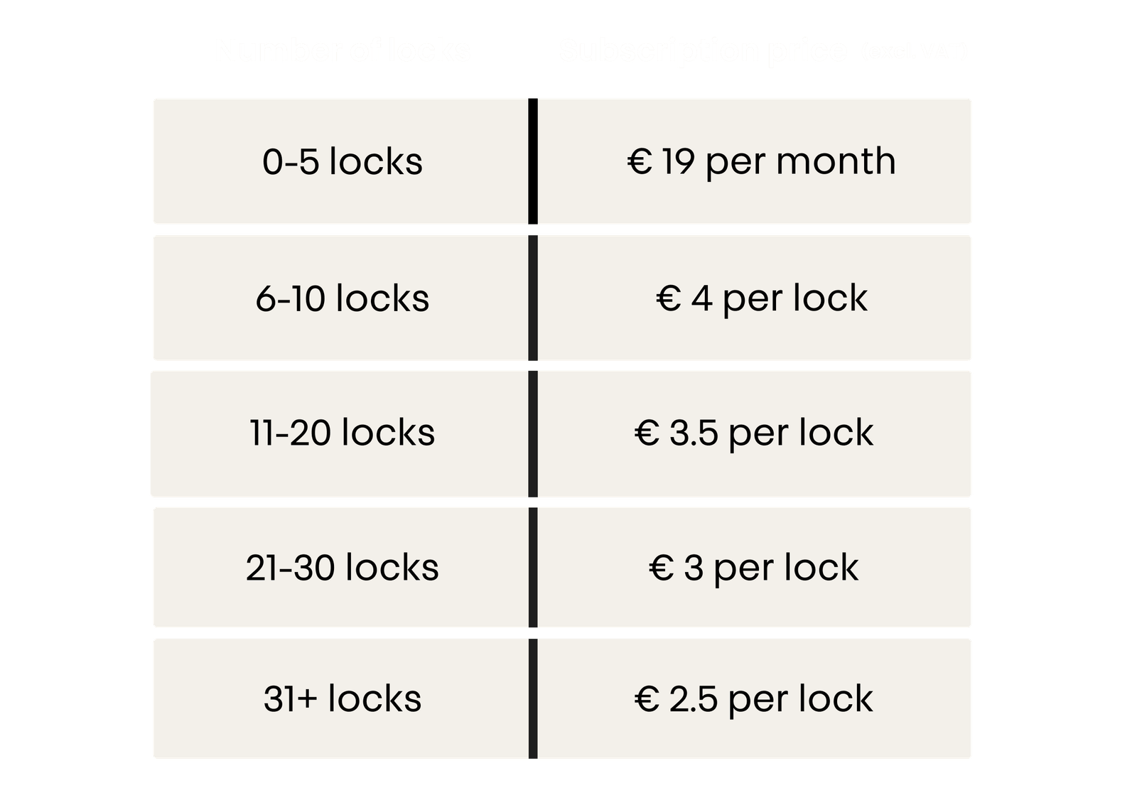 - Subscription – €19/month for up to 5 locks excl. VAT. You can cancel anytime.
